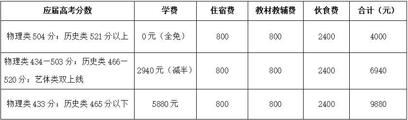 1.文化生:物理類504分以上的學費全免,434至503的學費減半;歷史類521以上學費全免,466分以上學費減半。